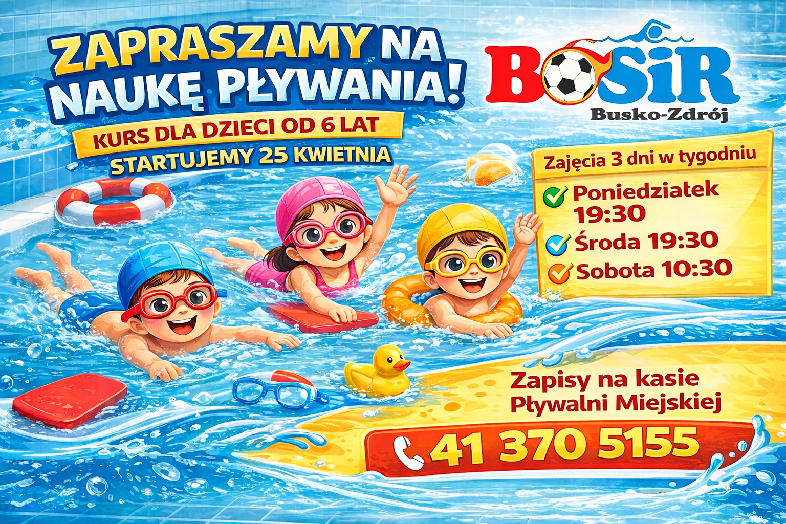 Spokojna atmosfera i indywidualne podejście na naszym kursie sprzyjają przełamywaniu lęków i zdobywaniu nowych, pływackich umiejętności To szansa dla Waszych pociech na zdobycie podstawowych umiejętności przed zbliżającymi się wakacjami! Zajęcia 3 razy w tygodniu: poniedziałki o godz. 19.30 środy o godz. 19.30 soboty o godz. 10.30 Ostatnio miejsca zapełniły się błyskawicznie – nie zwlekajcie z […]